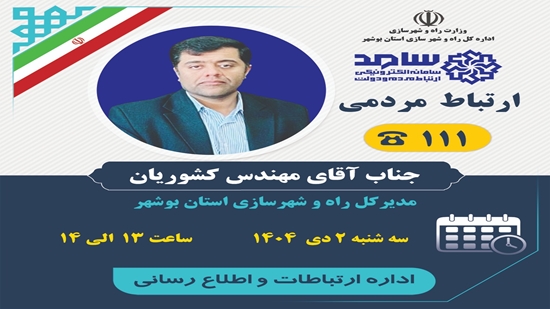 در همین راستا مورخ 1404/10/2از ساعت 13 تا 14 مدیرکل راه و شهرسازی استان در مرکز سامد بوشهر حضور یافته و مستقیما به تماسها پاسخ گفتند.