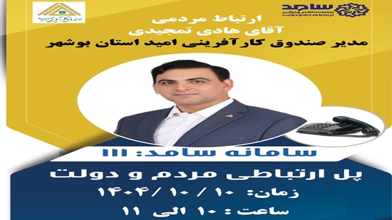 در همین راستا مورخ 1404/10/14از ساعت10 تا 11 مدیر صندوق کارآفرینی امید استان در مرکز سامد بوشهر حضور یافته و مستقیما به تماسها پاسخ گفتند.