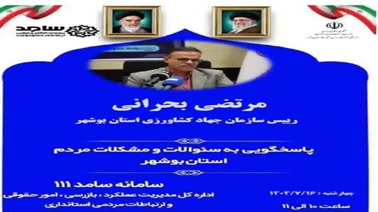 در همین راستا مورخ 1404/7/16 از ساعت 10 تا 11 مدیرکل جهاد کشاورزی استان بوشهر در مرکز سامد حضور یافته و مستقیما به تماسها پاسخ گفتند.
