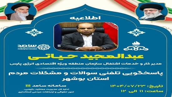 در همین راستا مورخ 1404/7/23 از ساعت 11 تا 12:30 مدیرکار و خدمات اشتغال سازمان منطقه ویژه اقتصادی انرژی پارس استان در مرکز سامد بوشهر  حضور یافته و مستقیما به تماسها پاسخ گفتند.