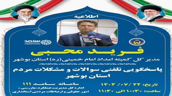 در همین راستا مورخ 1404/7/22 از ساعت :3010 تا 11:30 مدیرکل کمیته امداد امام خمینی (ره) استانداری بوشهر در مرکز سامد حضور یافته و مستقیما به تماسها پاسخ گفتند.